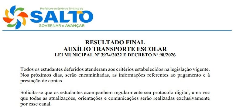 A Secretaria de Ação Social e Cidadania de Salto disponibilizou a lista final de análise dos requerimentos para o Auxílio Transporte Escolar.